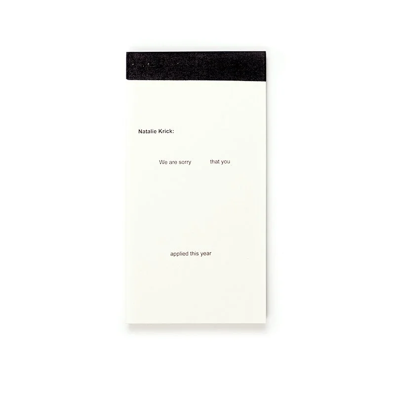 We are Sorry You Applied This Year is created from rejection letters received after applying to grants, residencies, teaching jobs, and other opportunities over the course of three years. The modified text is the result of deleting large swaths of the original letter and speaks to the mindset of the artist when reading letters intended for a gentle letdown.
